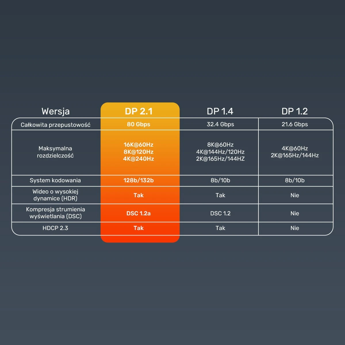Kabel obsługuje obraz do 8K przy 120 Hz, 4K do 240 Hz oraz 16K przy 60 Hz z DSC. Ma też przepustowość do 80 Gb/s, wspiera dynamiczny HDR i przesyła 32-bitowy nieskompresowany dźwięk w formatach 7.1, 5.1 i 2.0.